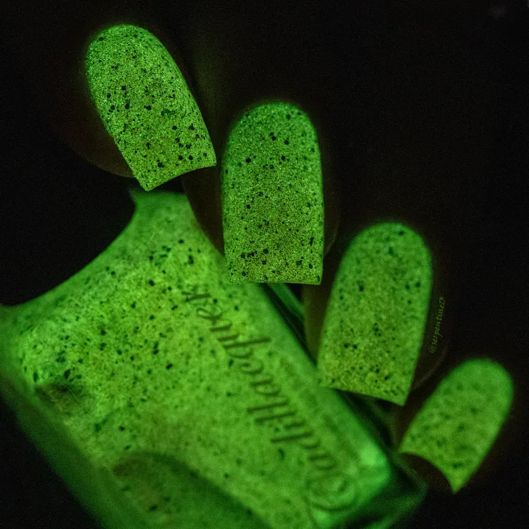 Cadillacquer Light the Flame este o nuanta de verde neon, cu glitter rosu metalic si efect "glow in the dark".
