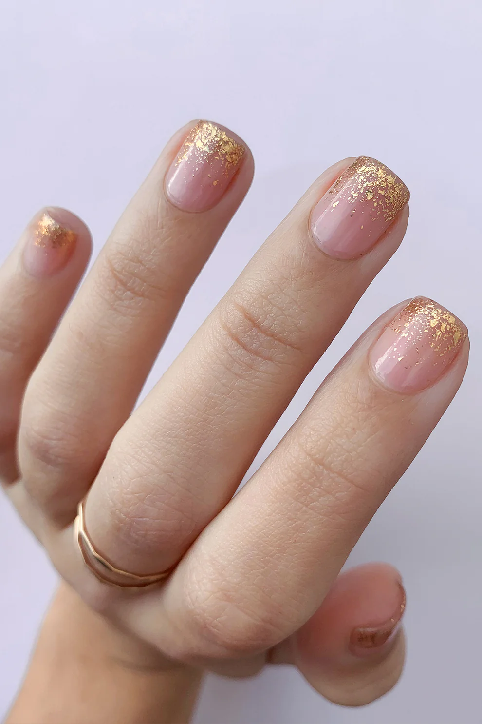 Un topper foarte elegant. Basa este foarte glossy and particulele aurii nu produc textura. Efectul este foarte dragut si peste unghii direct, puteti pune flakies doar peste o portiune a unghiei (dupa care un strat the top coat glossy) pentru nail art cu minim efort.