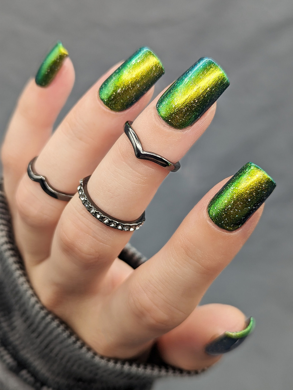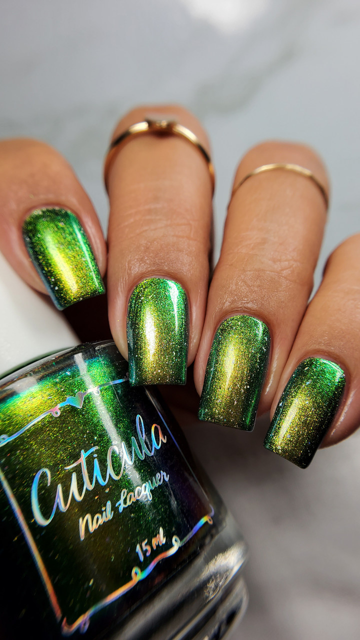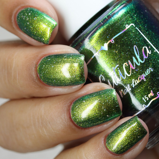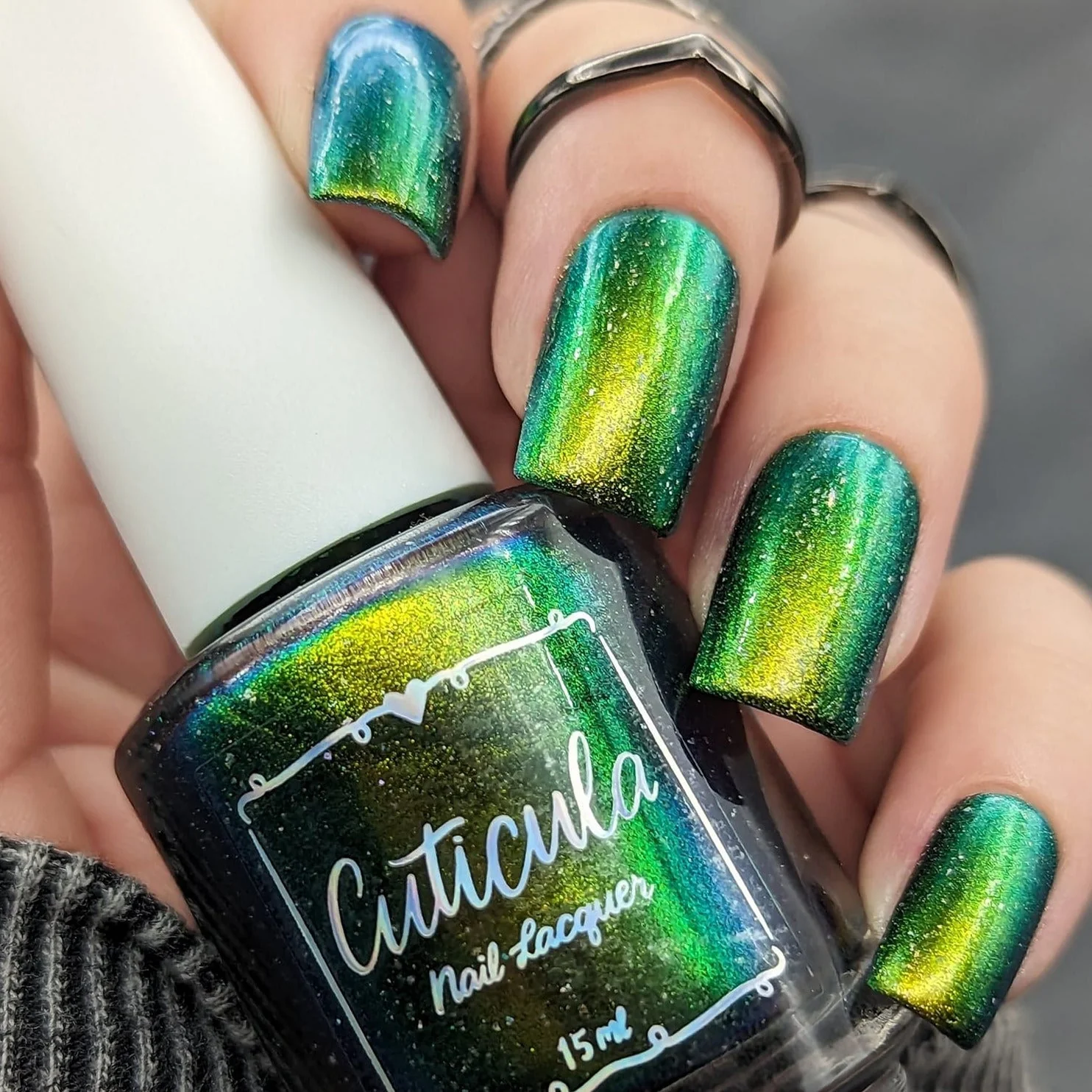 Cuticula Chromatose are o baza neagra, cu shimmer multicrom si flakes holografici.
