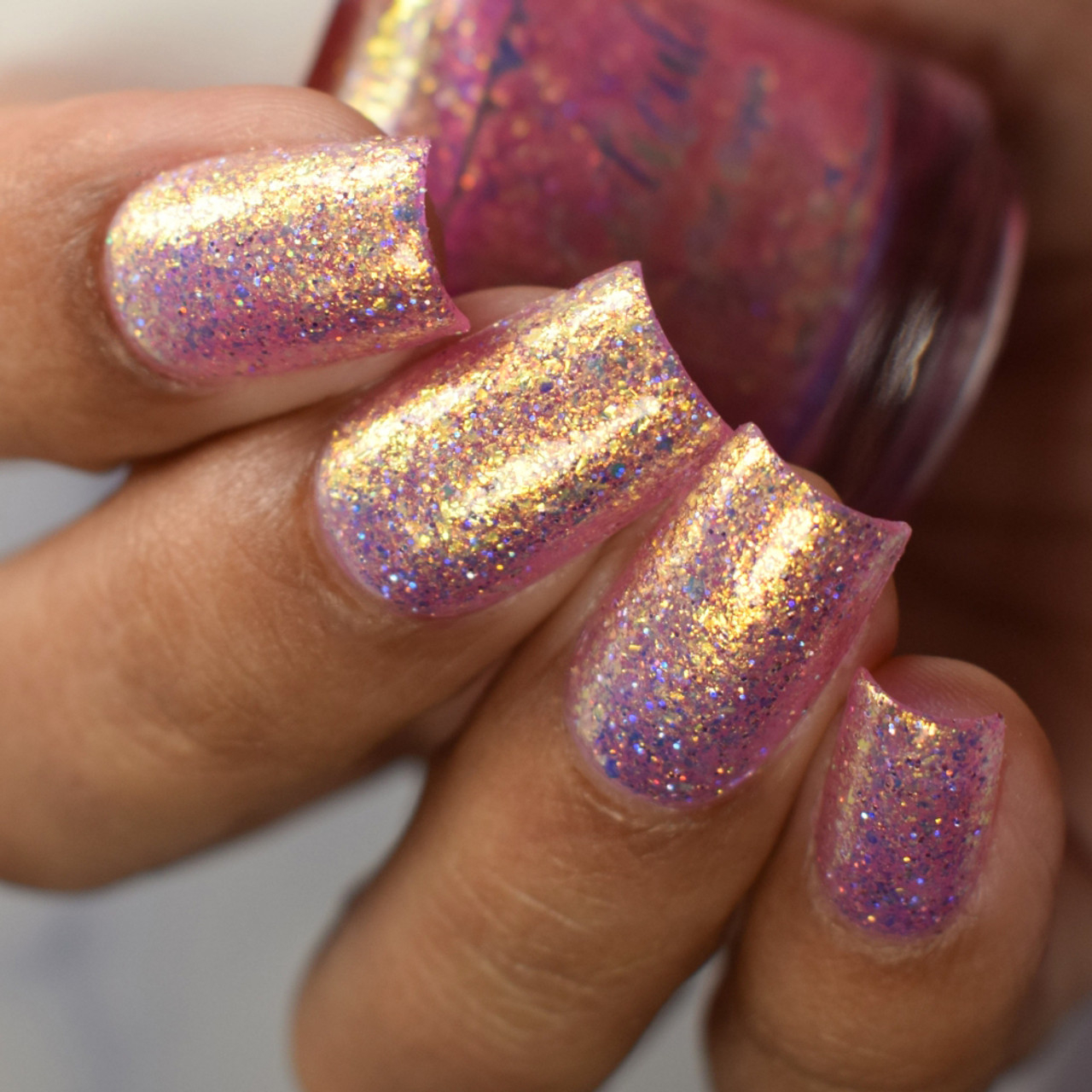 Cuticula You're Not Handsome, You're a Hunk! este o nuanta jelly de roz, cu flakes iridescenti si glitter holografic roz.