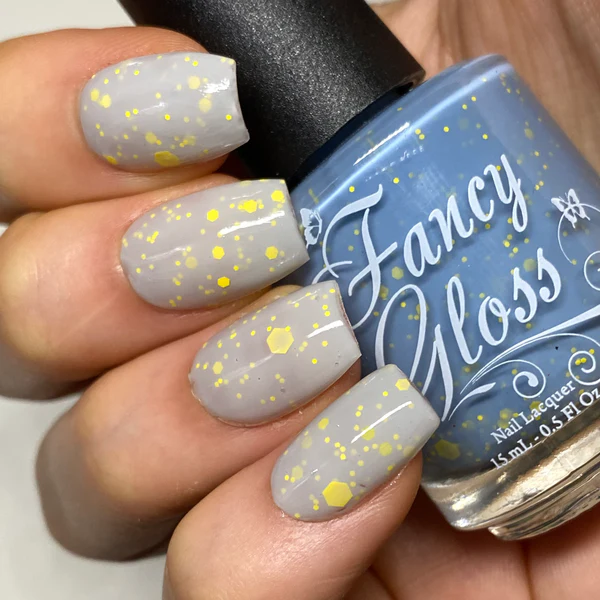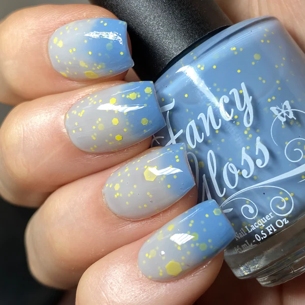 Fancy Gloss Shrunken Head este o nuanta cu efect termic si glitter galben, care trece de la albastru deschis ( la rece ) la gri ( la cald ) .
