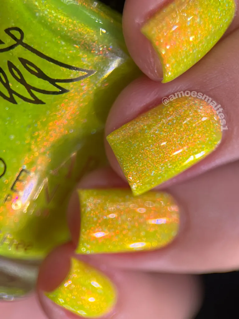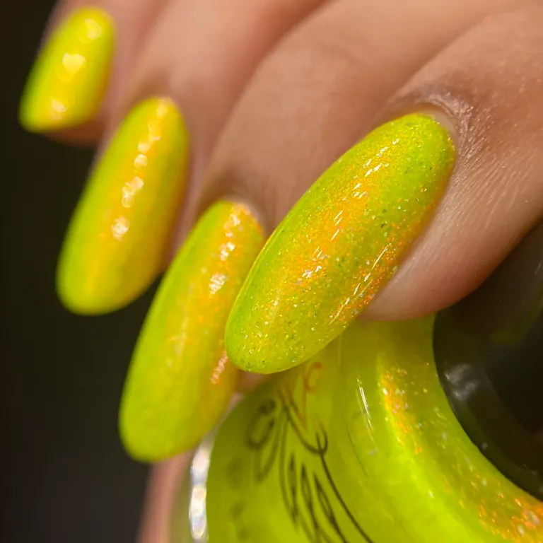 Phoenix Indie Come Home este o nuanta de galben jelly, cu shimmer aurora si flakes holografici.