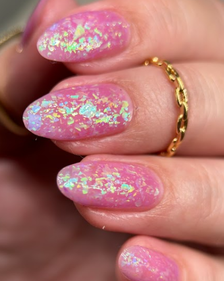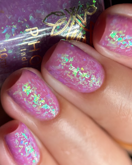 Phoenix Indie Esme are o baza jelly roz, cu flakes iridescenti.