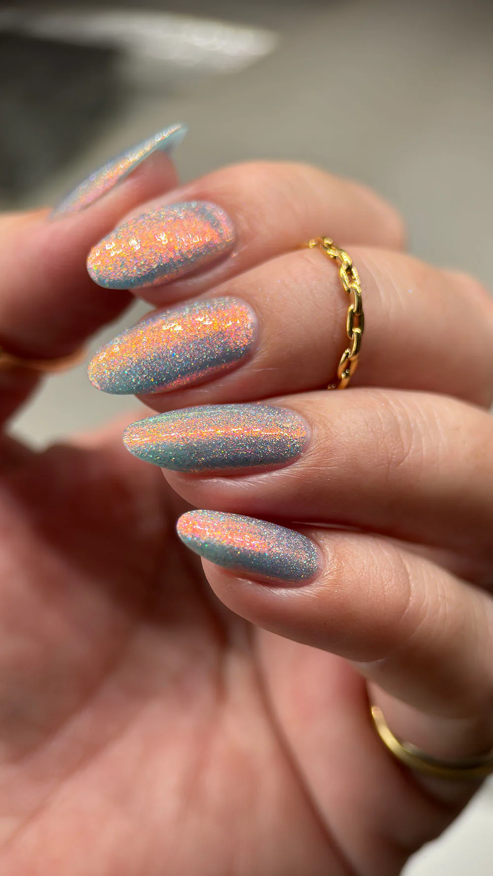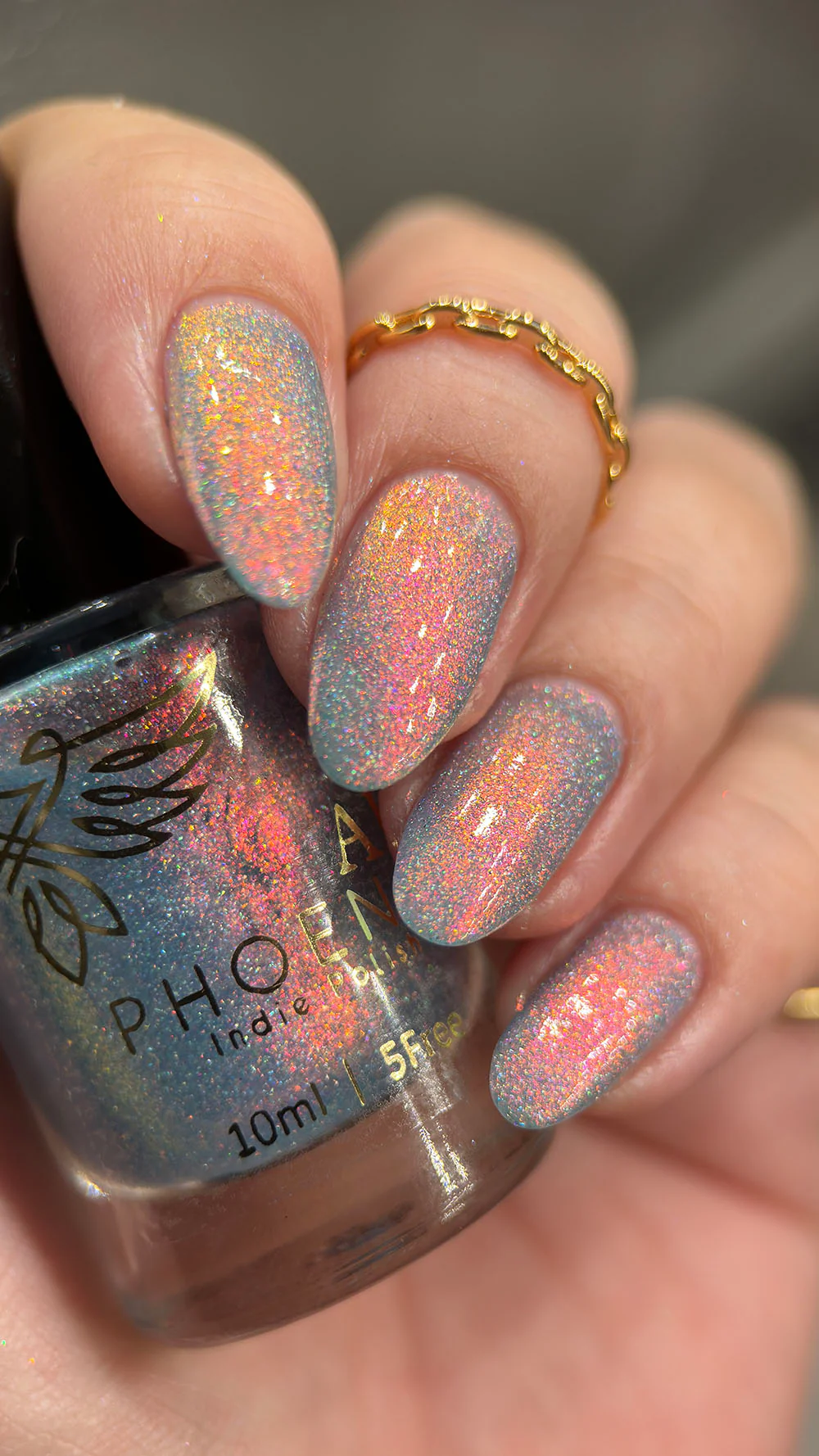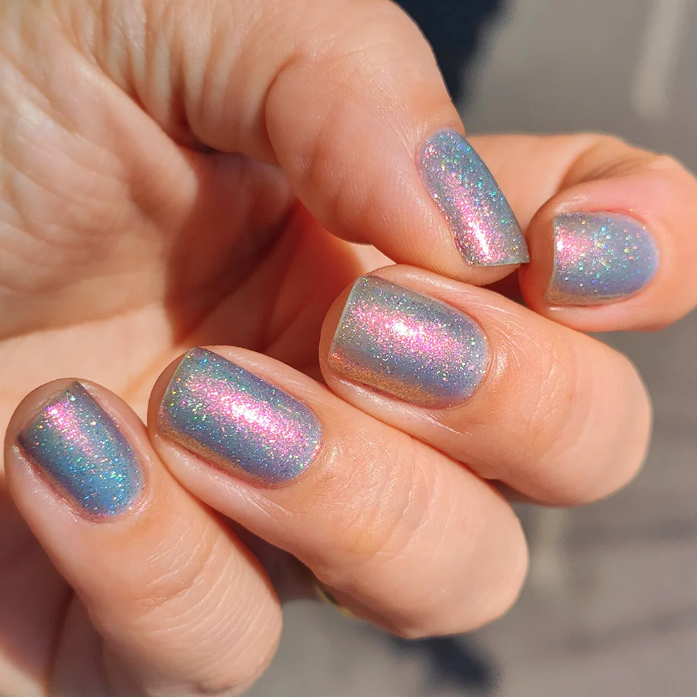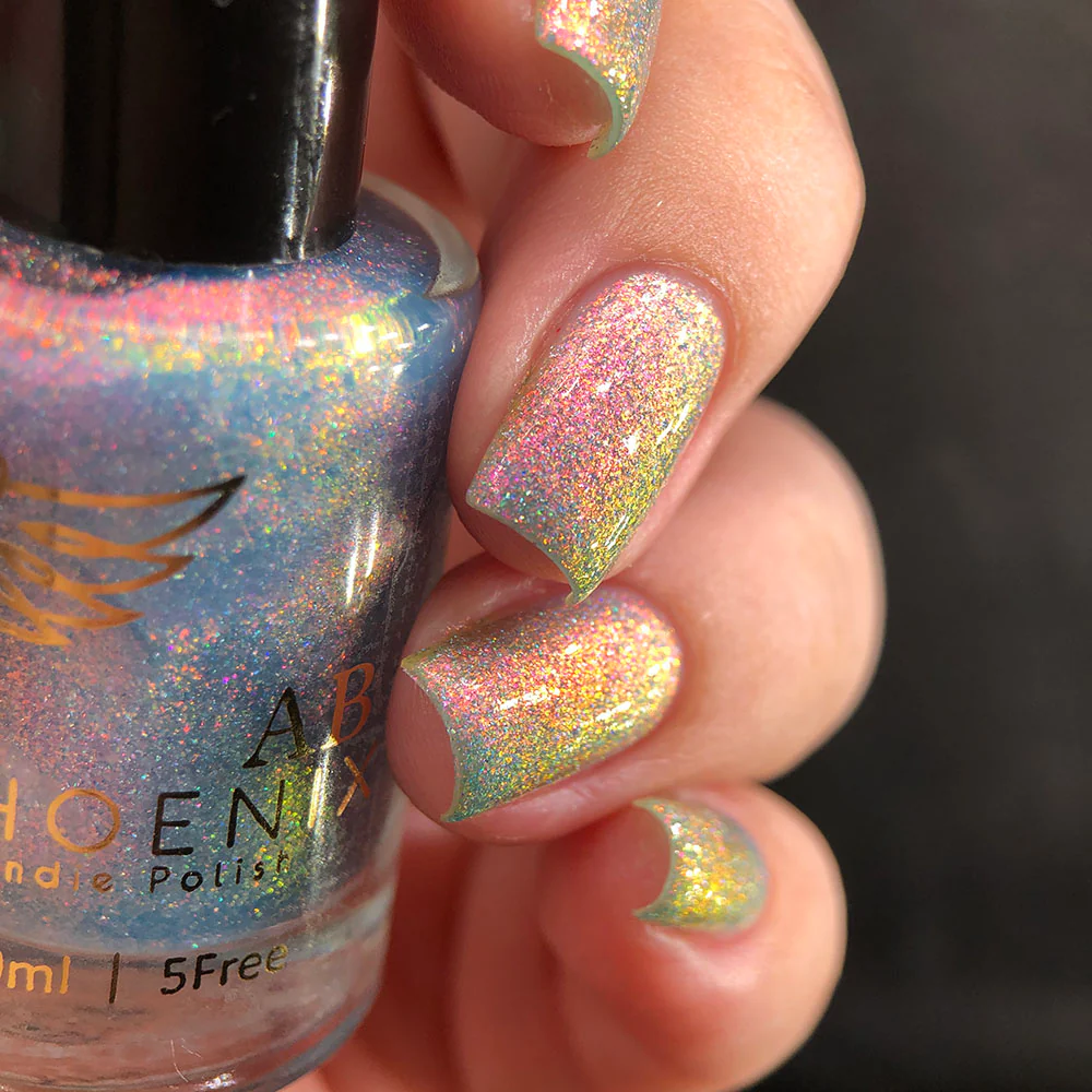 Phoenix Indie Lexi are o baza jelly albastru deschis, cu shimmer aurora si micro flakes holografici.