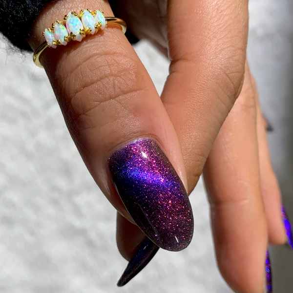 Trecerea de la magenta la culoarea de baza e impresionanta, magnetizata cu magnetul in forma de U. Parca ai avea trei oje deodata pe unghii!