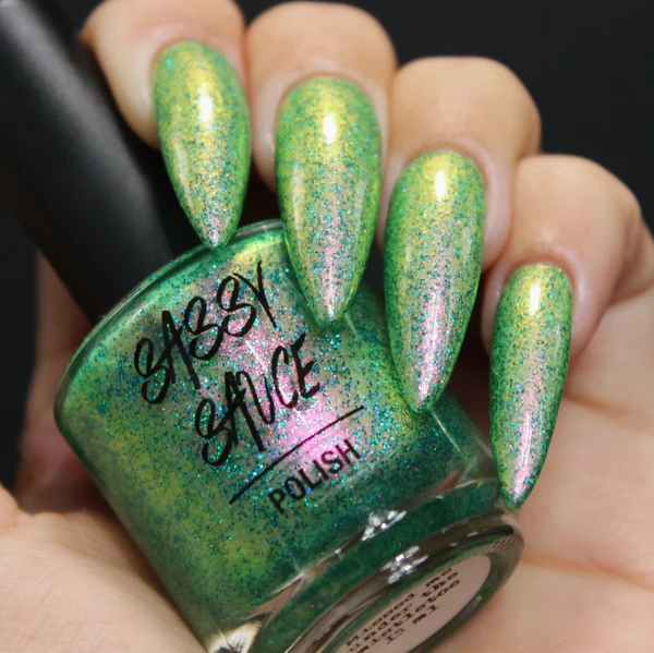 Sassy Sauce Missed Me Under the Mistletoe este o nuanta de verde, cu shimmer multicrom si glitter verde metalic.