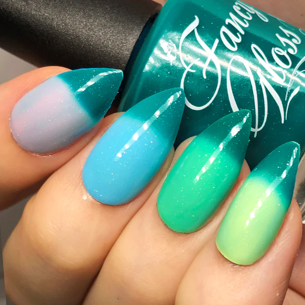 Fancy Gloss Thermal Top Coat este un top coat cu particule stralucitoare si efect termic, care trece de la turcoaz ( la rece ) la a fi aproape transparent ( la cald ). Acest top coat functioneaza mai bine aplicat peste culori deschise.