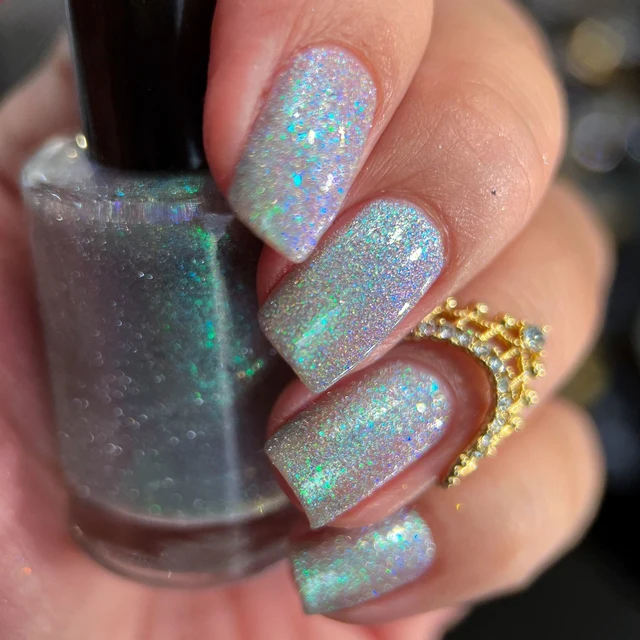 Phoenix Indie Never Get Caught este o nuanta de argintiu, cu flakes turcoaz si glitter care reflecta lumina.