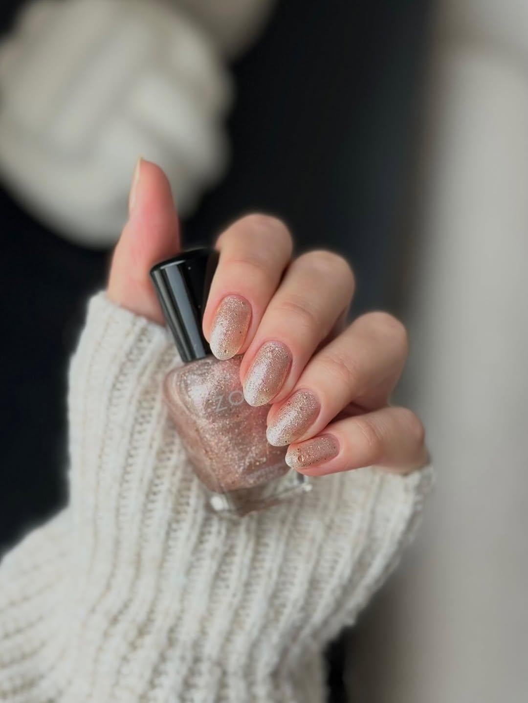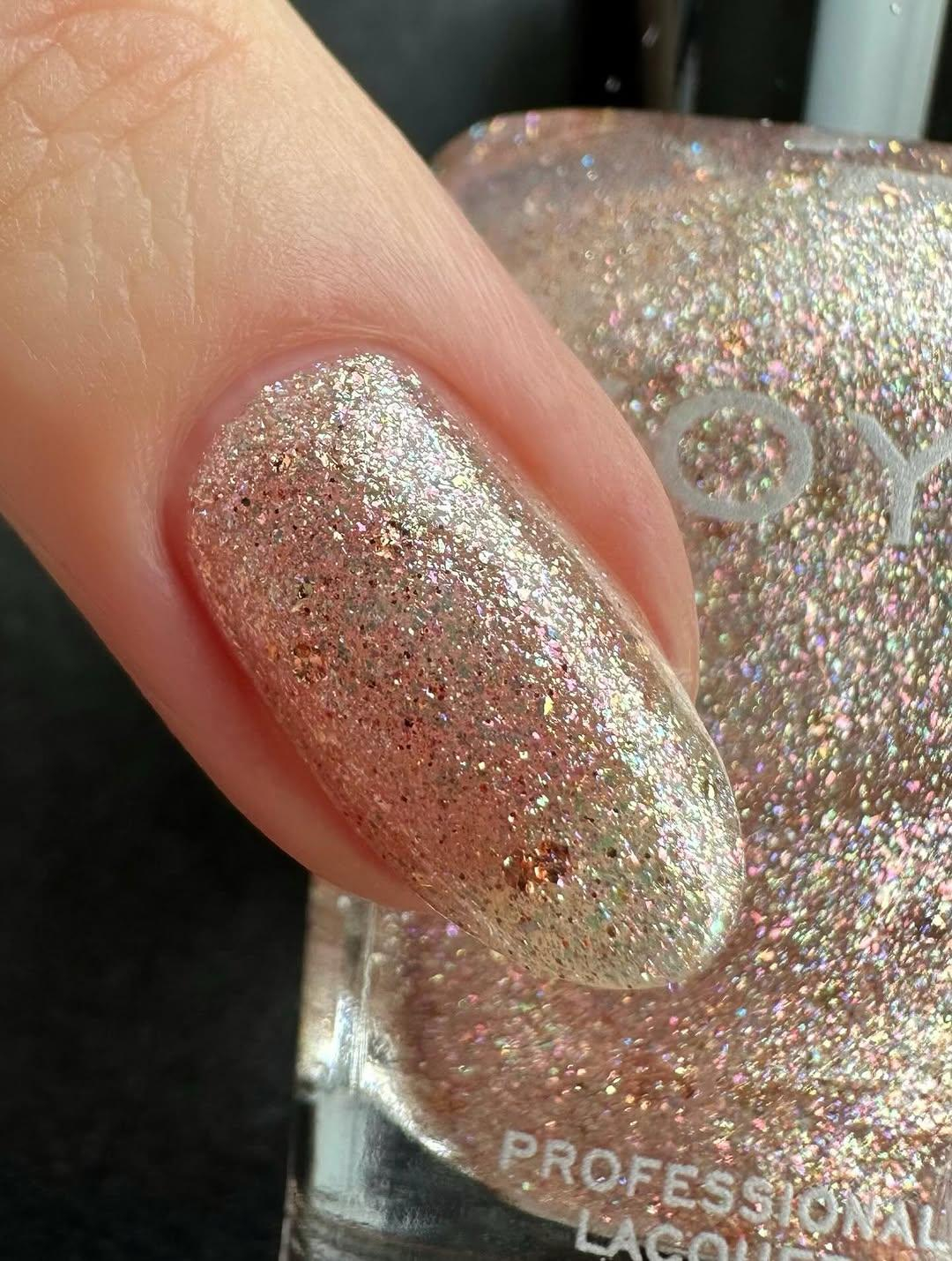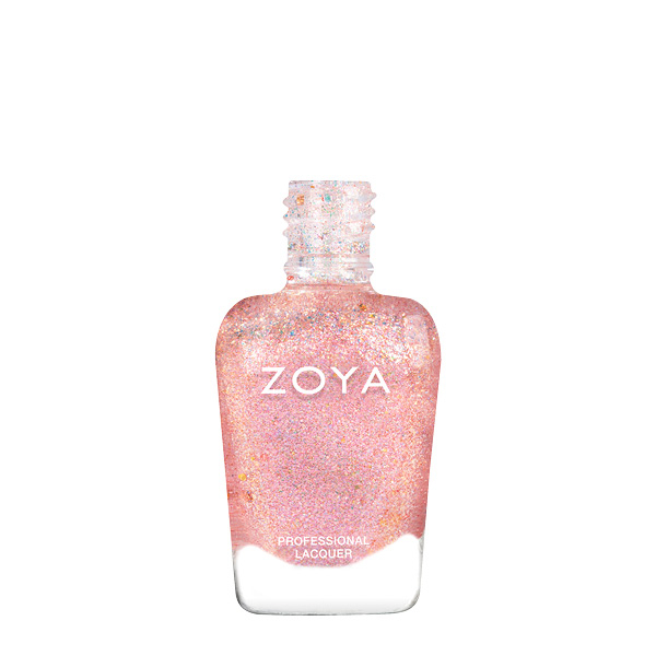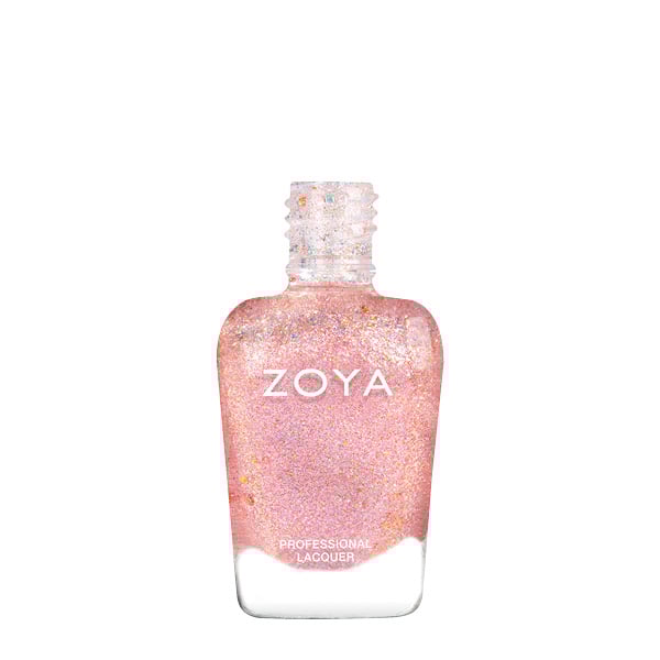 Zoya Zarin are o baza transparenta, cu glitter rose-gold si glitter iridescent.